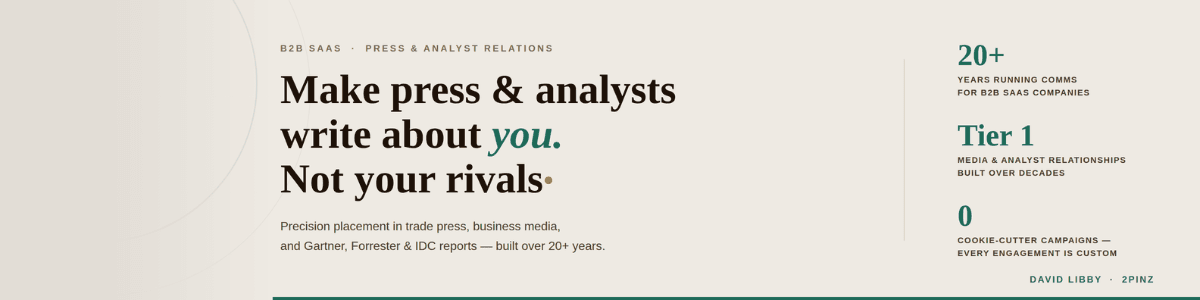 2pinz is a boutique consultancy that gets B2B SaaS companies into the stories, reports, and conversations that move buying decisions. We've done it for Anvilogic, KIBO Commerce, LeanData, and dozens of others.