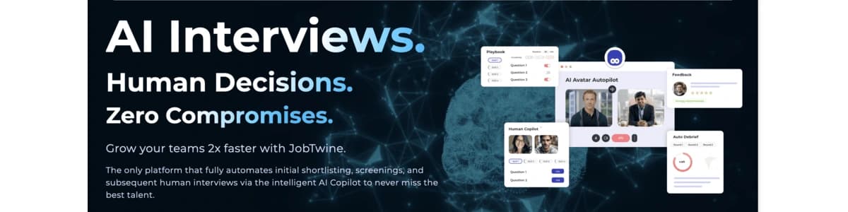JobTwine is an AI recruiter and interviewer platform, founded in 2022 and headquartered in Washington, D.C. It helps companies eliminate wrong hires and build high-performing teams through intelligent, end-to-end hiring automation. What They Do JobTwine replaces manual, inconsistent interview processes with a full-stack AI recruitment engine — handling smart scheduling, structured assessments, real-time candidate scoring, and 360° interview reports. Their AI interviewer, JayT, conducts live and async video interviews that adapt dynamically and generate data-backed hiring decisions at scale. Core Offerings — AI recruiter & interviewer for live and async video interviews — Smart Playbook Builder for role-specific evaluation frameworks — Interviewer Copilot for real-time interview guidance — Behavioral, technical & coding skills assessment — Sentiment, tone & engagement analysis — Interview-as-a-Service for on-demand expert interviewer access — ATS integrations: Greenhouse, Lever, Workday, BambooHR Who It's Built For Talent acquisition teams at startups, mid-market, and enterprises across tech, insurance, health-tech, and property sectors — hiring at scale across geographies. Proven Results — 50% less time spent on interviews — 80% lower risk of wrong hires — 3X faster offer closures — 40% reduction in time-to-hire Compliance & Security JobTwine adheres to GDPR, EEOC, and SOC 2 standards, with quarterly AI audits ensuring ethical, bias-free evaluations.